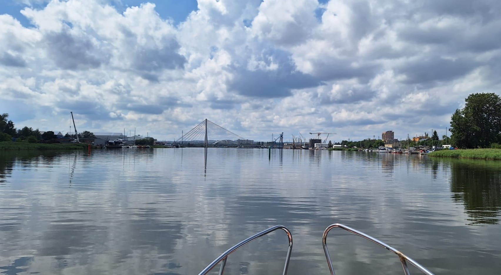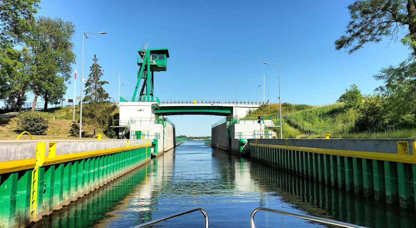 Po wizycie w Malborku płyniemy dalej Nogatem, pokonując śluzę Szonowo, aż do śluzy Biała Góra, która “wpuszcza” nas na Wisłę. Zanim to nastąpi możemy skorzystać z oferty Mariny Biała Góra. Decydując się na rejs Wisłą należy zwracać szczególną uwagę na poziom wody – przy niskich stanach odradzamy pływanie tą rzeką mniej doświadczonym wodniakom ze względu na niebezpieczeństwo wpłynięcia na mieliznę. Płynąc należy bezwzględnie nawigować według znaków brzegowych, które obserwujemy używając lornetki (jest na wyposażeniu każdej naszej łodzi), szczególnie od Białej Góry do Tczewa. Przepływając przez malowniczo położony nad Wisłą Tczew, możemy podziwiać dwa zabytkowe mosty, które od wieków stanowią ważne ogniwa komunikacyjne i ikony architektury. Pierwszym z nich jest Most Długodystansowy, który został otwarty w 1857 roku i pierwotnie pełnił rolę połączenia drogowego przez Wisłę. Jego konstrukcja, choć przeszła przez liczne modernizacje, nadal przyciąga uwagę swoim historycznym charakterem. Niestety most jest od lat nieczynny, a obecnie nawet częściowo rozebrany. Drugim z mostów jest nadal funkcjonujący Most Kolejowy, wybudowany w latach 1872-1875. W Tczewie możemy zacumować i udać się na spacer na pobliską Starówkę, warto też odwiedzić Muzeum Wisły. Sama przystań jest niewielka bo raptem na parę łodzi, nie mamy też pewności czy w sezonie 2025 będzie oferowała dostęp do prądu. Wiemy natomiast, że za cenę 15 zł można skorzystać z prysznica w pobliskiej restauracji Panorama w godzinach jej otwarcia. Z Tczewa do śluzy Przegalina płyniemy około dwóch godzin. Po drodze miniemy wejście na rzekę Szkarpawę (śluza Gdańska Głowa) – tędy będziemy wracać z rejsu.